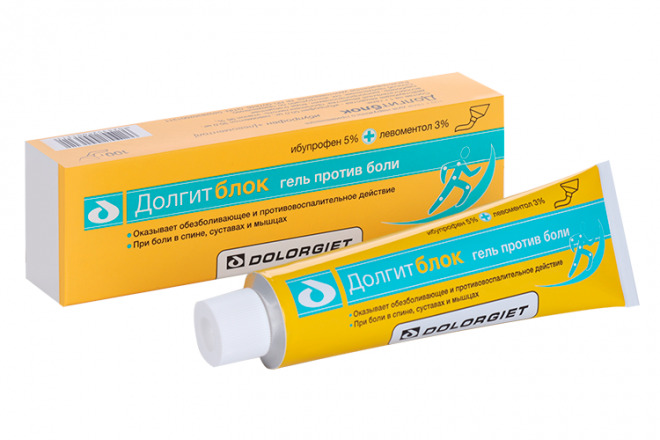 Фармакодинамика: Долгитблок представляет комбинацию двух активных веществ - ибупрофена и левоментола.Ибупрофен является нестероидным противовоспалительным средством, производным пропионовой кислоты, неизбирательно блокирует ферменты циклооксигеназу 1 (ЦОГ-1) и циклооксигеназу 2 (ЦОГ-2), вследствие чего подавляет синтез простагландинов - медиаторов боли, воспаления и гипертермической реакции. При местном применении ибупрофен оказывает обезболивающее, противовоспалительное и противоотечное действие.Левоментол оказывает местнораздражающее действие, что обуславливает быстрое развитие обезболивающего эффекта препарата. Комбинация ибупрофена и левоментола уменьшает боль и воспаление, эффективна при боли в суставах при движении и в покое, уменьшает утреннюю скованность суставов.Фармакокинетика: после нанесения на кожу ибупрофен обнаруживается в эпидермисе и дерме через 24 часа. Достигает высокой терапевтической концентрации в подлежащих мягких тканях, суставах и синовиальной жидкости. Клинически значимого системного всасывания практически не происходит. Максимальная концентрация ибупрофена в плазме крови при местном применении составляет 5% от уровня максимальной концентрации при пероральном применении ибупрофена. Ибупрофен подвергается метаболизму в печени. Выводится почками (в неизмененном виде не более 1%) и, в меньшей степени, с желчью через кишечник.Показания к применению: