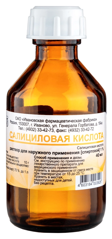 Отпускается по рецепту Нет Производитель Ивановская фармацевтическая фабрика ОАО Страна производителя Россия Действующее вещество Салициловая кислота Форма выпуска раствор для наружного применения спиртовой Дозировка 1% Общее количество в упаковке 1 Условия хранения В защищенном от света месте, при температуре 15–25 °C Срок годности 3 года -