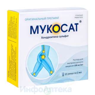 Мукосат® содержит хондроитина сульфат, получаемый из тканей крупного рогатого скота. Хондроитина сульфат является высокомолекулярным мукополисахаридом, замедляющим резорбцию костной ткани и снижающим потерю кальция. Хондроитина сульфат улучшает фосфорно-кальциевый обмен в хрящевой ткани, ускоряет процессы ее репарации, тормозит процессы дегенерации (разрушения) хрящевой ткани; препятствует коллапсу соединительной ткани; ингибирует ферменты, вызывающие поражение хрящевой ткани, стимулирует синтез глюкозаминогликанов, способствует регенерации (восстановлению) суставной сумки и хрящевых поверхностей суставов, увеличивает продукцию внутрисуставной жидкости. Это приводит к уменьшению болезненности и увеличению подвижности пораженных суставов.Показания к применению:
