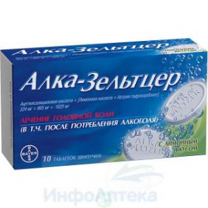 Круглые, плоские таблетки белого цвета, на одной стороне гравировка «ALKA SELTZER» в выступающем по периметру выпуклом круге. Обратная сторона имеет фаску.