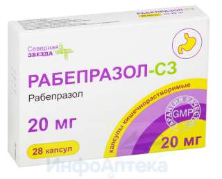Отпускается по рецепту Да Производитель Северная звезда НАО Страна производителя Россия Действующее вещество Рабепразол Форма выпуска капсулы кишечнорастворимые Дозировка 20 мг Общее количество в упаковке 28 Условия хранения В защищенном от света месте, при температуре не выше 25 °C Срок годности 3 года -