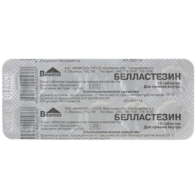 Отпускается по рецепту Нет Производитель Вифитех ЗАО Страна производителя Россия Действующее вещество Белладонны листьев экстракт+Бензокаин Форма выпуска таблетки Общее количество в упаковке 10 Условия хранения В сухом, защищенном от света месте, при температуре не выше 25 °C Срок годности 3 года -