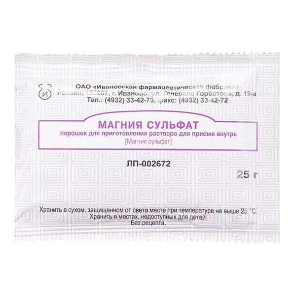 Отпускается по рецепту Да Производитель Тульская фармацевтическая фабрика ООО Страна производителя Россия Действующее вещество Магния Сульфат Форма выпуска порошок для приготовления раствора для приема внутрь Общее количество в упаковке 1 Условия хранения В сухом, защищенном от света месте, при температуре не выше 25 °C Срок годности 5 лет -