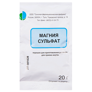 Отпускается по рецепту Да Производитель Тульская фармацевтическая фабрика ООО Страна производителя Россия Действующее вещество Магния Сульфат -