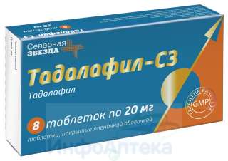 Отпускается по рецепту Да Производитель Северная звезда НАО Страна производителя Россия Действующее вещество Тадалафил Форма выпуска таблетки, покрытые пленочной оболочкой Дозировка 20 мг Общее количество в упаковке 8 Условия хранения В защищенном от света месте, при температуре не выше 25 °C Срок годности 3 года -